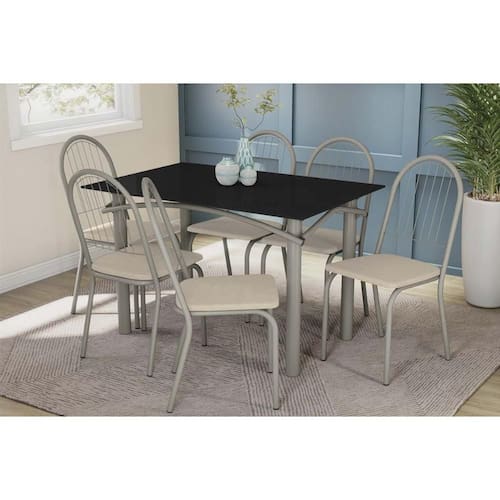 Sala de Jantar Completa Elba Tampo Madeirado c/ Vidro 120cm e 6 Cadeiras Noruega Niquel/Preto - Courano Bege - Kappesberg Abaixo segue os produtos do KIT: Sala de Jantar Completa Elba Tampo Madeirado c/ Vidro 120cm e 6 Cadeiras Noruega Niquel/Preto - Courano Bege - Kappesberg