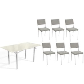 Sala de Jantar Completa Elba Tampo Madeirado c/ Vidro 160cm e 6 Cadeiras Zaria Cromada/Off White - Boucle Cinza - Kappesberg Abaixo segue os produtos do KIT: Sala de Jantar Completa Elba Tampo Madeirado c/ Vidro 160cm e 6 Cadeiras Zaria Cromada/Off White - Boucle Cinza - Kappesberg