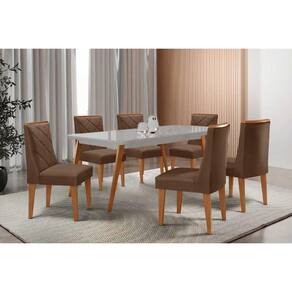Sala de Jantar Completa Havana c/ Tampo Madeirado c/ Vidro Canto Curvo 180x90cm e 6 Cadeiras Pietá Naturale/Off White - Suede Marrom - Rufato - Sala de Jantar Completa Rufato com 6 Cadeiras