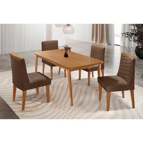 Sala de Jantar Completa Havana c/ Tampo Madeirado Canto Curvo 120x80cm e 4 Cadeiras Maldivas Naturale - Suede Marrom - Rufato