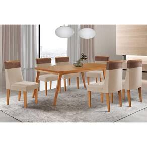 Sala de Jantar Completa Havana c/ Tampo Madeirado Canto Curvo 180x90cm e 6 Cadeiras Jaspe Naturale - Suede Creme - Rufato Abaixo segue os produtos do KIT: Sala de Jantar Completa Havana c/ Tampo Madeirado Canto Curvo 180x90cm e 6 Cadeiras Jaspe Naturale - Suede Creme - Rufato