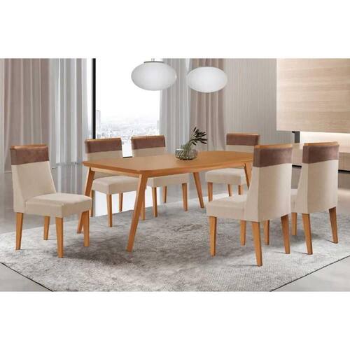 Sala de Jantar Completa Havana c/ Tampo Madeirado Canto Curvo 180x90cm e 6 Cadeiras Jaspe Naturale - Suede Creme - Rufato - Sala de Jantar Completa Rufato com 6 Cadeiras