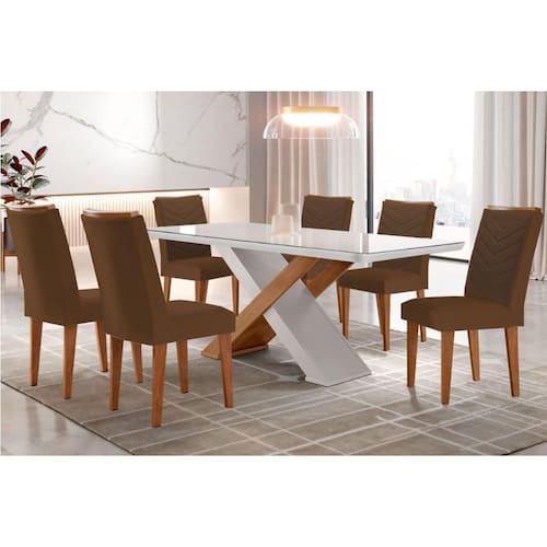 Sala de Jantar Completa Imperatriz Tampo Madeirado c/ Vidro Canto Curvo 180x90 e 6 Cadeiras Londrina Imbuia/Off White - Suede Marrom - Rufato
