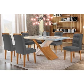 Sala de Jantar Completa Imperatriz Tampo Madeirado c/ Vidro Curvo 180x90 e 6 Cadeiras Imperatriz Imbuia/Off White - Suede Grafite - Rufato - Blush