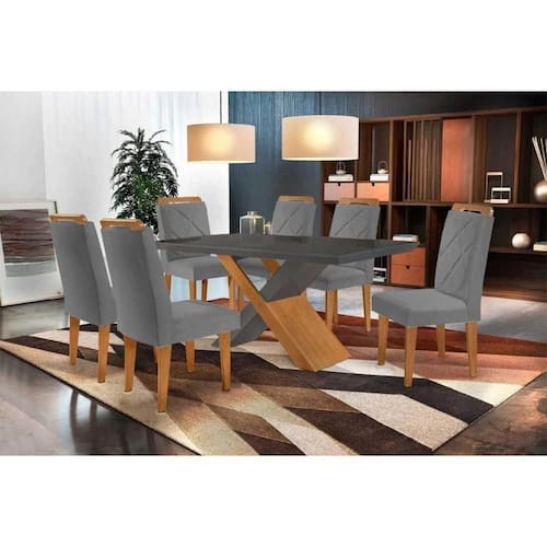 Sala De Jantar Completa Imperatriz Tampo Madeirado C/ Vidro Curvo 180x90 E 6 Cadeiras Melissa Imbuia - Veludo Grafite - Rufato