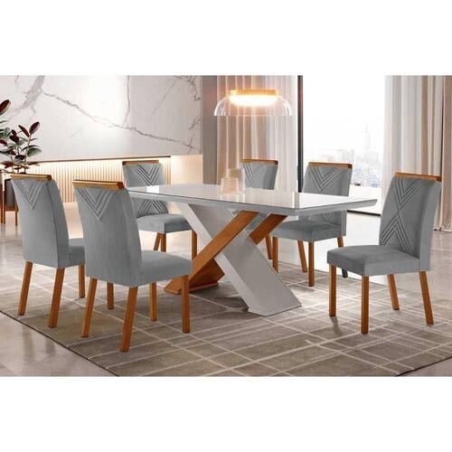 Sala De Jantar Completa Imperatriz Tampo Madeirado C/ Vidro Reto 180x90 E 6 Cadeiras Amsterdã Imbuia/off White - Veludo Grafite - Rufato