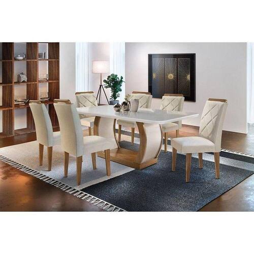 Sala de Jantar Completa Jade c/ Tampo Madeirado c/ Vidro Canto Curvo 180cm + 6 Cadeiras Melissa Imbuia/Veludo Creme - Rufato