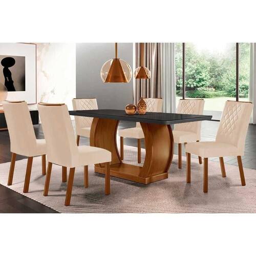 Sala De Jantar Completa Jade C/ Tampo Madeirado C/ Vidro Canto Curvo 180x90cm E 6 Cadeiras Jade Imbuia/grafite - Suede Creme - Rufato