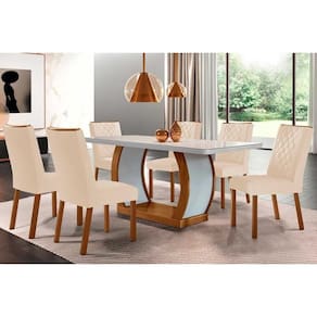 Sala de Jantar Completa Jade Tampo Madeirado c/ Vidro Curvo 180x90 e 6 Cadeiras Jade Imbuia/Veludo Creme/Pérola - Rufato