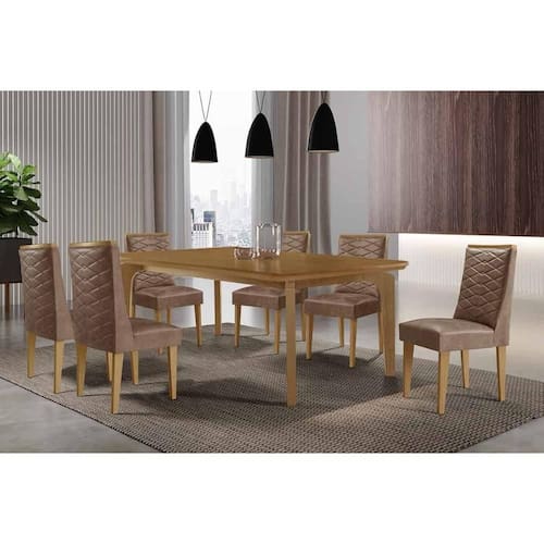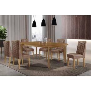 Sala de Jantar Completa Londrina c/ Tampo Madeirado Canto Curvo 180x90cm e 6 Cadeiras Dafne Naturale - Corano Capuccino - Rufato