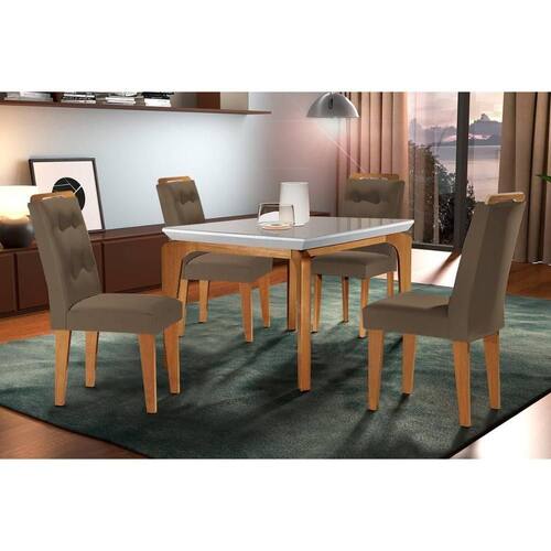 Sala de Jantar Completa Londrina c/ Tampo Madeirado Vidro Canto Curvo 120x80cm e 4 cadeiras Imperatriz Imbuia/Off White - Suede Capuccino - Rufato