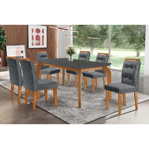 Sala de Jantar Completa Londrina c/ Tampo Madeirado Vidro Canto Curvo 180x90cm e 6 cadeiras Imperatriz Imbuia/Grafite - Suede Grafite - Rufato Abaixo segue os produtos do KIT: Sala de Jantar Completa Londrina c/ Tampo Madeirado Vidro Canto Curvo 180x90cm e 6 cadeiras Imperatriz Imbuia/Grafite - Suede Grafite - Rufato
