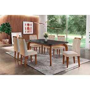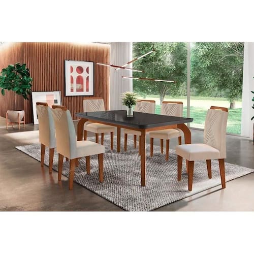 Sala de Jantar Completa Londrina Tampo Madeirado c/ Vidro Curvo 180x90 e 6 Cadeiras Amsterdã Capuccino/Suede Creme - Rufato