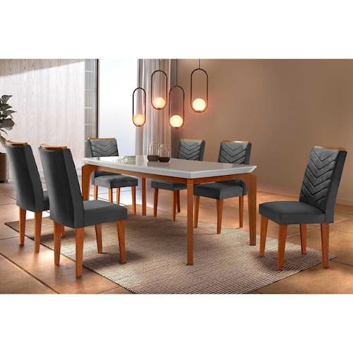 Abaixo segue os produtos do KIT: Sala de Jantar Completa Londrina Tampo Madeirado c/ Vidro Curvo 180x90cm e 6 Cadeiras Londrina Imbuia/Off White - Linho Grafite - Rufato