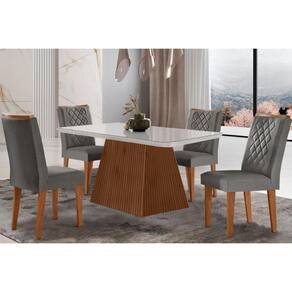 Sala De Jantar Completa Luna C/ Tampo Madeirado C/ Vidro Canto Curvo 120x80cm E 4 Cadeiras Jade Imbuia/off White - Linho Grafite - Rufato