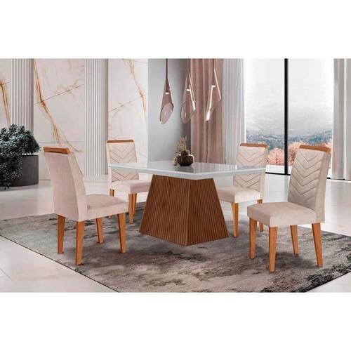 Sala De Jantar Completa Luna C/ Tampo Madeirado C/ Vidro Canto Curvo 120x80cm E 4 Cadeiras Londrina Imbuia/off White - Suede Creme - Rufato