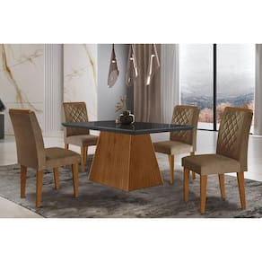 Sala de Jantar Completa Luna c/ Tampo Madeirado Vidro Canto Curvo 120x80cm e 4 cadeiras Jade Imbuia/Grafite - Suede Capuccino - Rufato