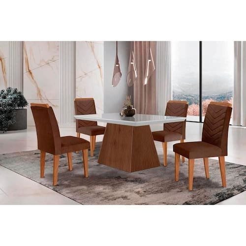 Sala de Jantar Completa Luna c/ Tampo Madeirado Vidro Canto Curvo 120x80cm e 4 cadeiras Londrina Imbuia/Off White - Suede Marrom - Rufato - Blush