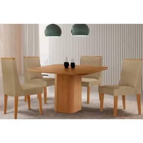 Sala de Jantar Completa Maldivas c/ Tampo Madeirado Canto Curvo 90x90cm e 4 Cadeiras Dakota Naturale - Linho Bege - Rufato