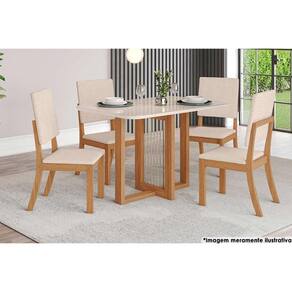 Sala de Jantar Completa Natalí c/ Tampo Madeirado c/ Vidro Curvo 120x80cm e 4 Cadeiras Milla Nature/Veludo Light Linho - Henn