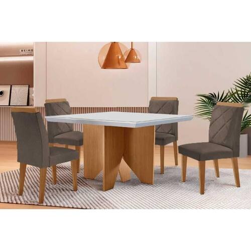 Sala de Jantar Completa Nevada c/ Tampo Madeirado c/ Vidro Canto Curvo 90x90cm e 4 Cadeiras Pietá Naturale/Off White - Linho Capuccino - Rufato Abaixo segue os produtos do KIT: Sala de Jantar Completa Nevada c/ Tampo Madeirado c/ Vidro Canto Curvo 90x90cm e 4 Cadeiras Pietá Naturale/Off White - Linho Capuccino - Rufato