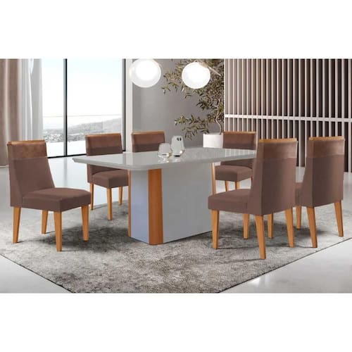 Sala de Jantar Completa Pietá c/ Tampo Madeirado c/ Vidro Canto Curvo 180x90cm e 6 Cadeiras Jaspe Naturale/Off White - Suede Marrom - Rufato Abaixo segue os produtos do KIT: Sala de Jantar Completa Pietá c/ Tampo Madeirado c/ Vidro Canto Curvo 180x90cm e 6 Cadeiras Jaspe Naturale/Off White - Suede Marrom - Rufato
