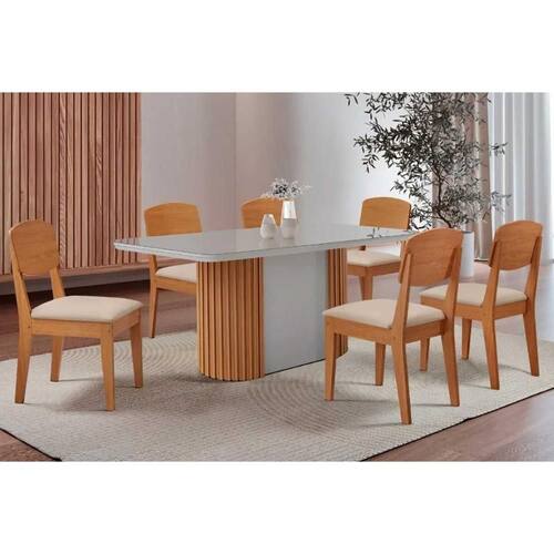 Sala de Jantar Completa Pilar c/ Tampo Madeirado c/ Vidro Canto Curvo 180x90cm e 6 Cadeiras Havana Naturale/Off White - Suede Creme - Rufato Abaixo segue os produtos do KIT: Sala de Jantar Completa Pilar c/ Tampo Madeirado c/ Vidro Canto Curvo 180x90cm e 6 Cadeiras Havana Naturale/Off White - Suede Creme - Rufato