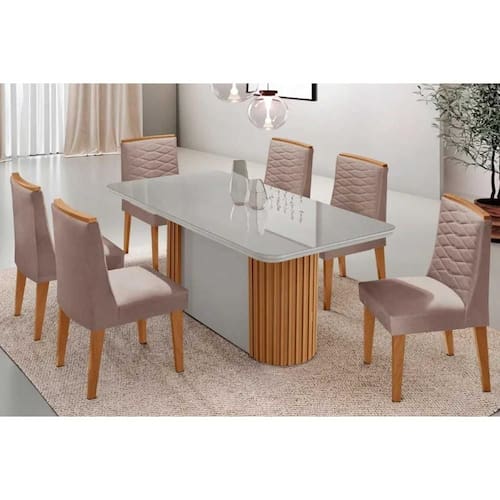 Sala de Jantar Completa Pilar c/ Tampo Madeirado c/ Vidro Canto Curvo 180x90cm e 6 Cadeiras Maldivas Naturale/Off White - Linho Capuccino - Rufato Abaixo segue os produtos do KIT: Sala de Jantar Completa Pilar c/ Tampo Madeirado c/ Vidro Canto Curvo 180x90cm e 6 Cadeiras Maldivas Naturale/Off White - Linho Capuccino - Rufato