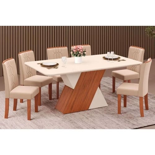Sala De Jantar Completa Rubi Tampo Madeirado C/ Vidro Canto Reto 170x90cm E 6 Cadeiras Zoe Freijo/off White/off White - Suede Creme - Dj Móveis