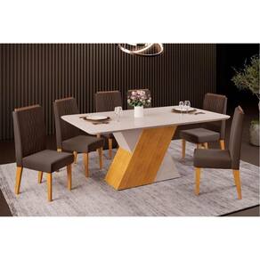Sala de Jantar Completa Rubi Tampo Madeirado c/ Vidro Curvo 170x90cm e 6 Cadeiras Lia Cedro/Off White/Off White - Suede Moca - DJ Móveis