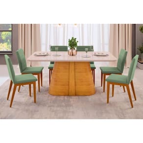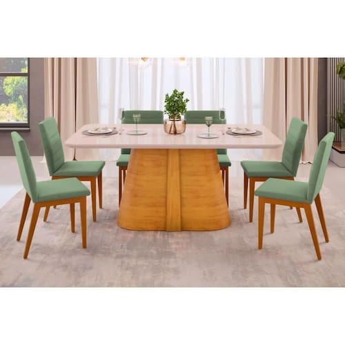 Sala de Jantar Completa Ryze Tampo Madeirado c/ Vidro Curvo 180x100cm e 6 Cadeiras Sofia Cedro/Off White - Ipe/Linho Mate - DJ Móveis Abaixo segue os produtos do KIT: Sala de Jantar Completa Ryze Tampo Madeirado c/ Vidro Curvo 180x100cm e 6 Cadeiras Sofia Cedro/Off White - Ipe/Linho Mate - DJ Móveis