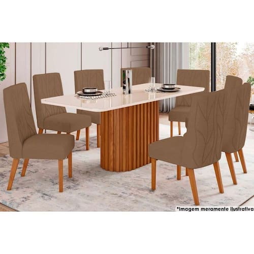 Sala de Jantar Completa Solana c/ Tampo Madeirado c/ Vidro Curvo 200x90cm e 8 Cadeiras Eloá Nature/Suede Light Marrom Amêndoa - Henn Abaixo segue os produtos do KIT: Sala de Jantar Completa Solana c/ Tampo Madeirado c/ Vidro Curvo 200x90cm e 8 Cadeiras Eloá Nature/Suede Light Marrom Amêndoa - Henn