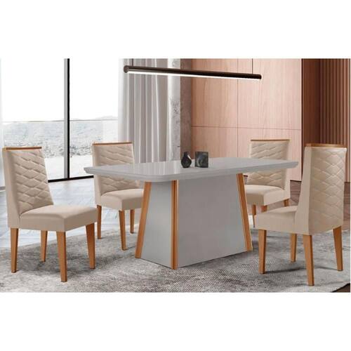 Sala de Jantar Completa Tilia c/ Tampo Madeirado c/ Vidro Canto Curvo 120x80cm e 4 Cadeiras Dafne Naturale/Off White - Suede Creme - Rufato - Sala de Jantar Completa Rufato com Mesa e 4 Cadeiras