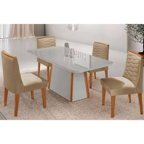 Sala de Jantar Completa Tilia c/ Tampo Madeirado c/ Vidro Canto Curvo 120x80cm e 4 Cadeiras Maldivas Naturale/Off White - Linho Bege - Rufato Abaixo segue os produtos do KIT: Sala de Jantar Completa Tilia c/ Tampo Madeirado c/ Vidro Canto Curvo 120x80cm e 4 Cadeiras Maldivas Naturale/Off White - Linho Bege - Rufato