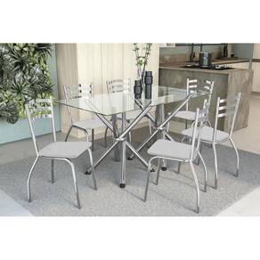 Sala de Jantar Completa Volga c/ Tampo Vidro 150cm + 6 Cadeiras Portugal Cromado/Courano Branco - Kappesberg