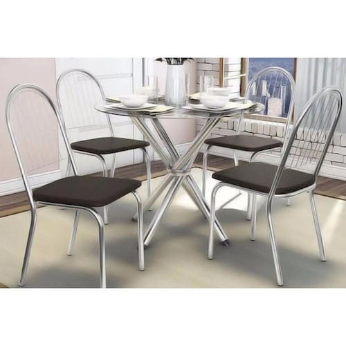 Sala de Jantar Completa Volga c/ Tampo Vidro 95cm + 4 Cadeiras Noruega Cromado/Courano Preto - Kappesberg