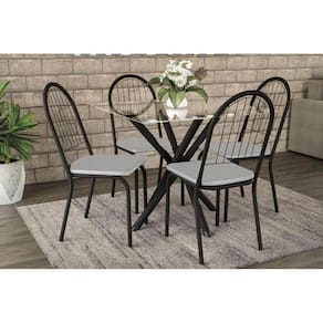 Sala de Jantar Completa Volga c/ Tampo Vidro 95cm + 4 Cadeiras Noruega Preto Fosco/Courano Branco - Kappesberg