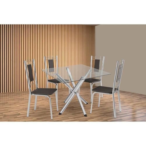 Sala de Jantar Completa Volga c/ Tampo de Vidro 90cm e 4 Cadeiras Florença Cromada - Courano Preto - Kappesberg