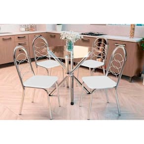 Sala de Jantar Completa Volga c/ Tampo de Vidro 95cm e 4 Cadeiras Holanda Cromada - Courano Branco - Kappesberg - Prata