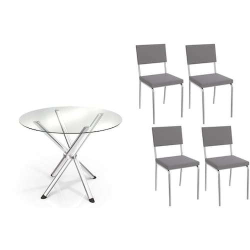 Sala De Jantar Completa Volga C/ Tampo De Vidro 95cm E 4 Cadeiras Zaria Cromada - Suede Cinza - Kappesberg