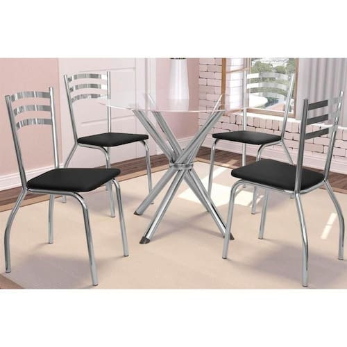 Sala de Jantar Completa Volga c/ Tampo de Vidro 95x95cm e 4 Cadeiras Portugal Cromada - Preto - Kappesberg