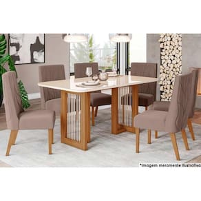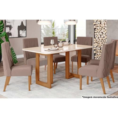Abaixo segue os produtos do KIT: Sala de Jantar Completa Yara c/ Tampo Madeirado c/ Vidro Curvo 160x90cm e 6 Cadeiras Eloa Nature/Veludo Light Marrom Amêndoa - Henn