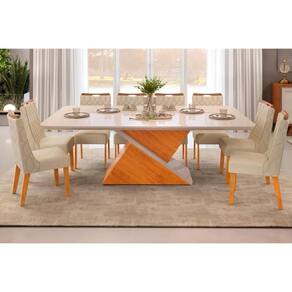 Sala De Jantar Completa Zafira Tampo Madeirado C/ Vidro Curvo 200x100cm E 8 Cadeiras Bia Cedro/off White - Freijo/linho Neve - Dj Móveis