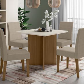 Características: Mesa com tampo quadrado de 90x90 cm em MDP de 21 mm com bordas chanfradas; Vidro pintado de 3 mm colado sob o tampo: mais durabilidade, facilidade na limpeza e visual sofisticado; Base da mesa em formato de ?X? com sapatas plásticas reguláveis para maior estabilidade; Cadeiras modelo Josi com estrutura resistente, pés em MDF 18 mm; Revestimento em tecido Suede aveludado: maciez e charme ao toque; Encosto com bordado sutil e assento com espuma de densidade D20 para maior conforto; Acabamento em pintura UV: proteção contra desgaste e facilidade na higienização; Produto ecologicamente correto, com embalagem reforçada para evitar avarias no transporte;