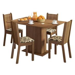 - Itens Inclusos: 1 mesa de madeira com pé pedestal e tampo em madeira; 4 cadeiras de madeira com assento estofado