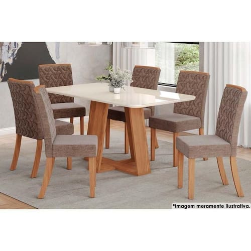 Sala de Jantar Completa Lins c/ Tampo Madeirado c/ Vidro Curvo 160x90cm e 6 Cadeiras Esther Nature/Cacao - Henn