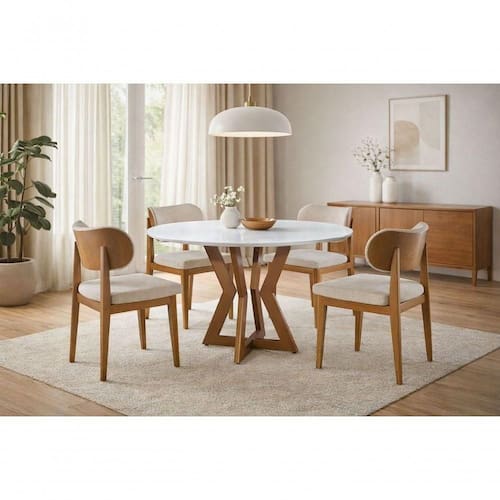Deixe sua sala de jantar mais elegante e aconchegante com este conjunto que une design moderno, conforto e durabilidade. A mesa redonda Ibiza, com base em madeira maciça e tampo com vidro off white, combina perfeitamente com as cadeiras Organick, produzidas em madeira maciça Tauari, com encosto curvado e assento estofado.