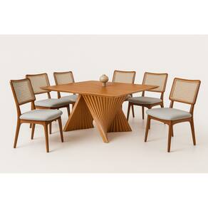 A mesa de jantar Topázio é um móvel ideal para sua casa, com design moderno e elegante, que vai agregar a sua decoração tornando sua sala de jantar mais aconchegante! Ela tem uma base super estilosa e moderna com um efeito torcido que é um arraso. Esse modelo tem a base em madeira maciça de Eucalipto e o tampo em MDF laminado, garantindo uma mesa resistente e duradoutra. As Cadeiras Zara possuem um design moderno e um acabamento muito delicado, que vai trazer ao seu ambiente um ar sofisticado e elegante! As cadeiras tem a estrutura em madeira maciça tauari, madeira ecologicamente correta, e o seu encosto é fabricado em fibra de rattan natural (telinha). Quanto a durabilidade, esse modelo não deixa nada a desejar, o seu assento é fabricado com espuma de densidade D-26, muito confortável, e as cadeiras suportam ate 150Kg distribuídos. Ideal para compor salas de jantar sofisticadas, áreas gourmet ou espaços de convivência, essa cadeira une durabilidade, ergonomia e um design versátil que harmoniza com diversos estilos de decoração.