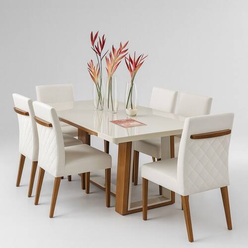 A Sala de Jantar Real é essencial para seu lar, ela é ideal para realizar suas refeições e contemplar as melhores reuniões em família e amigos e, em especial, as confraternizações que envolvem toda alegria e harmonia que uma família reunida é capaz de transmitir. Além disso, oferece consigo diversos benefícios: A mesa Real é produzida com tampo de MDF com 40 mm de espessura, e vidro 3mm. Sua base é em madeira maciça Tauari, seca em estufa e imunizada, garantindo durabilidade. Seu design minimalista se adequa harmoniozamente ao estilo das cadeiras Luxury, que são perfeitas para compor o conjunto de sua sala de jantar. As Cadeiras Luxury são a perfeição em produto. Possuem uma segurança e conforto elevada. Sua estrutura é composta por madeira maciça tauari e a densidade da espuma é D-23 para assentos e D-20 para encosto. Cada peça é cuidadosamente selecionada e trabalhada para criar uma obra de arte única. Devido à fabricação manual, o tempo solicitado é um pouco maior do que o convencional por isso pedimos um tempo um pouco maior do que os demais produtos. No entanto, garantimos que o resultado vale a pena. Não perca tempo! Garanta já a sua!!