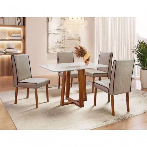 A sala de jantar Pedro é ideal para complementar ambientes menores, a mesa possui estrutura toda em madeira maciça e tampo em MDF. Além disso possui vidro de 4mm na cor off white, proporcionando maior durabilidade e simplicidade na limpeza diária do móvel. As cadeiras possuem seus pés trabalhados em madeira maciça oferecendo uma durabilidade extrema e segura.